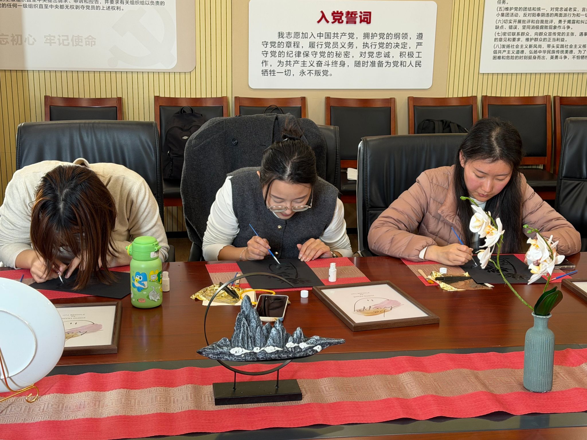为进一步做好新时代高校廉洁文化建设,*av探花 将红色主题教育与非物质文化遗产传承深度融合,于11月26日下午举行“手作传廉韵·红心耀金箔”——非遗技艺里的清廉党建手工课。二十余名师生党员围坐一堂,以金箔画勾勒“竹影莲香”的清廉风骨,用3D红船拼接“初心如磐”的红色信仰,在非遗技艺中厚植廉洁底色,淬炼党性初心。