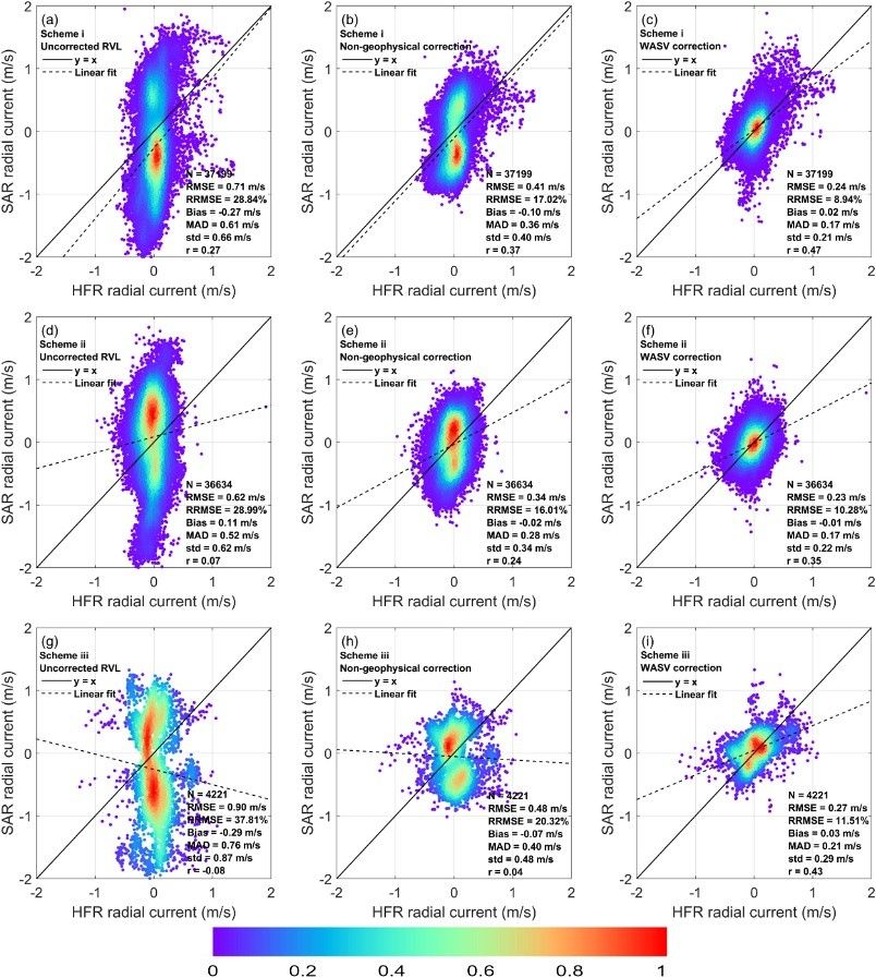 图5 HF雷达测得速度与SAR反演速度的散点密度图